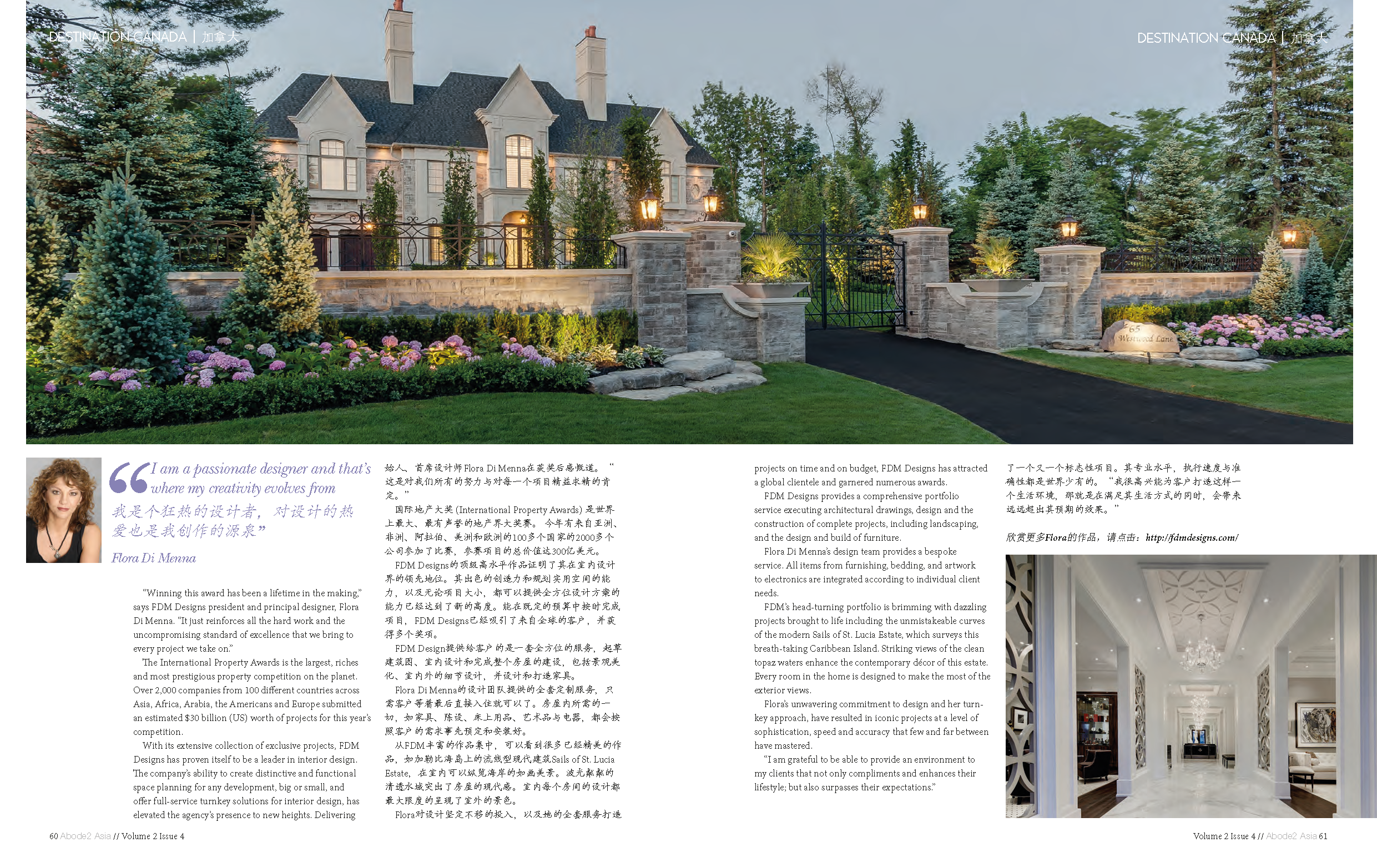 FDM Designs is an award-winning interior design firm based in Toronto, Canada. Launched in 1987 by visionary designer Flora Di Menna, FDM Designs have crafted the interiors of luxury homes across the globe to decadent levels.