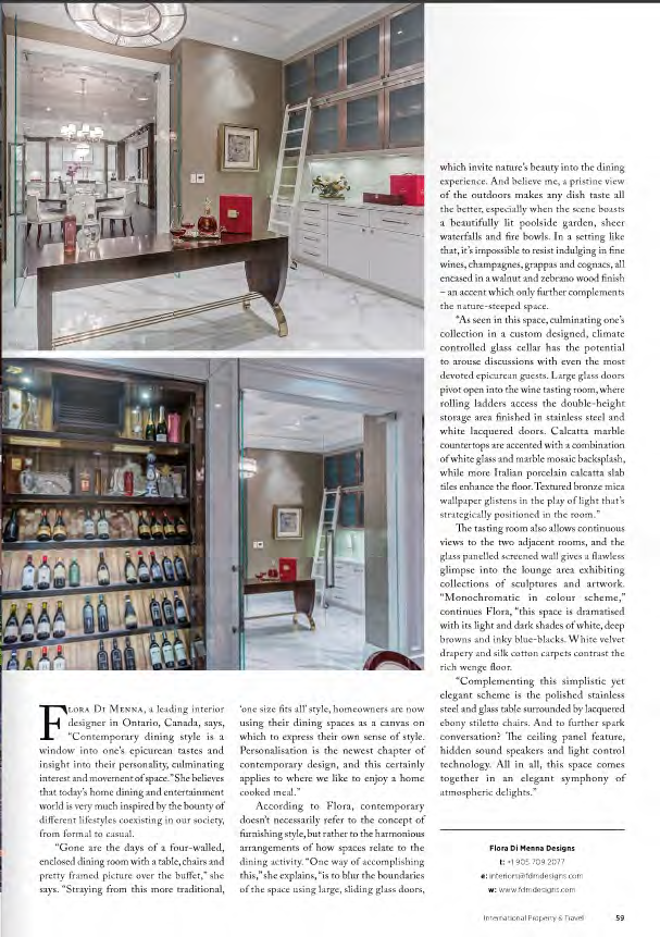 Established in 1987, Flora Di Menna Designs has garnered international praise for excellence in innovative interior design, winning numerous awards for luxury estate homes, hospitality facilities, presentation centres, corporate offices and condominium developments.
